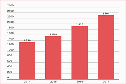 Le chiffre d’affaires mondial de l’e-commerce BtoC s’est élevé à 2 304 milliards de dollars en 2017, en hausse de 24,8% par rapport à 2016, selon eMarketer.